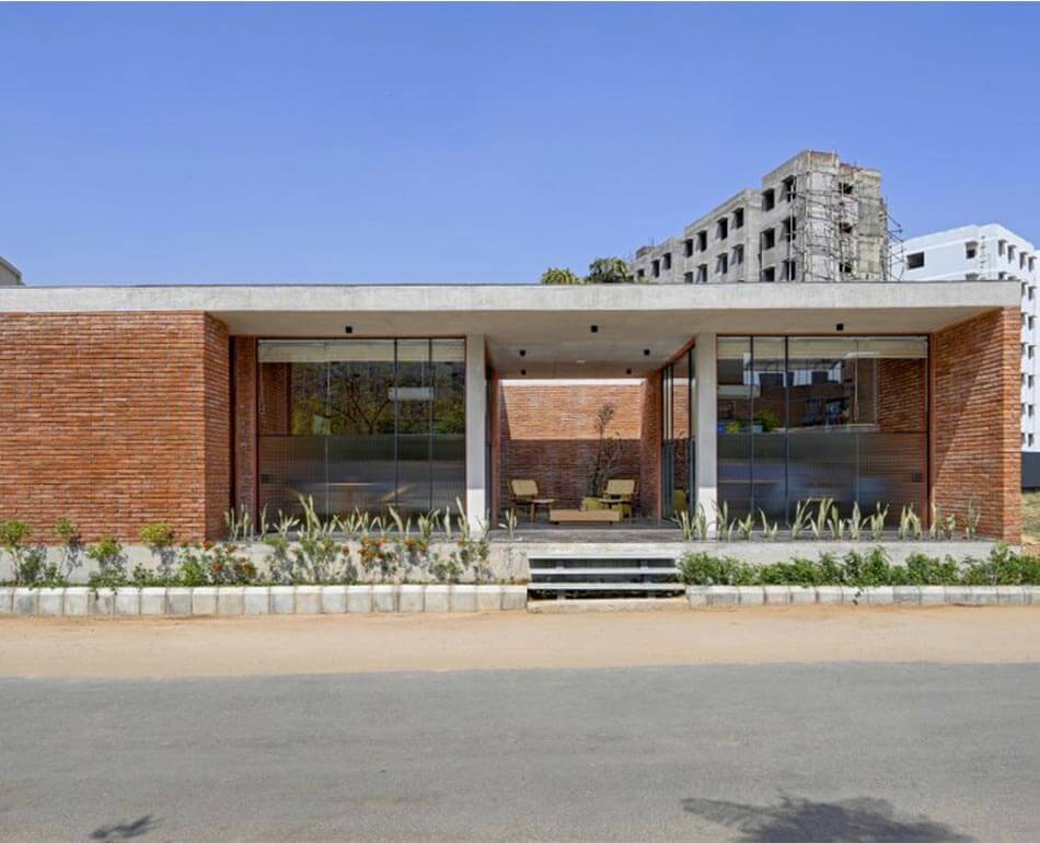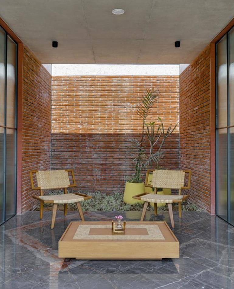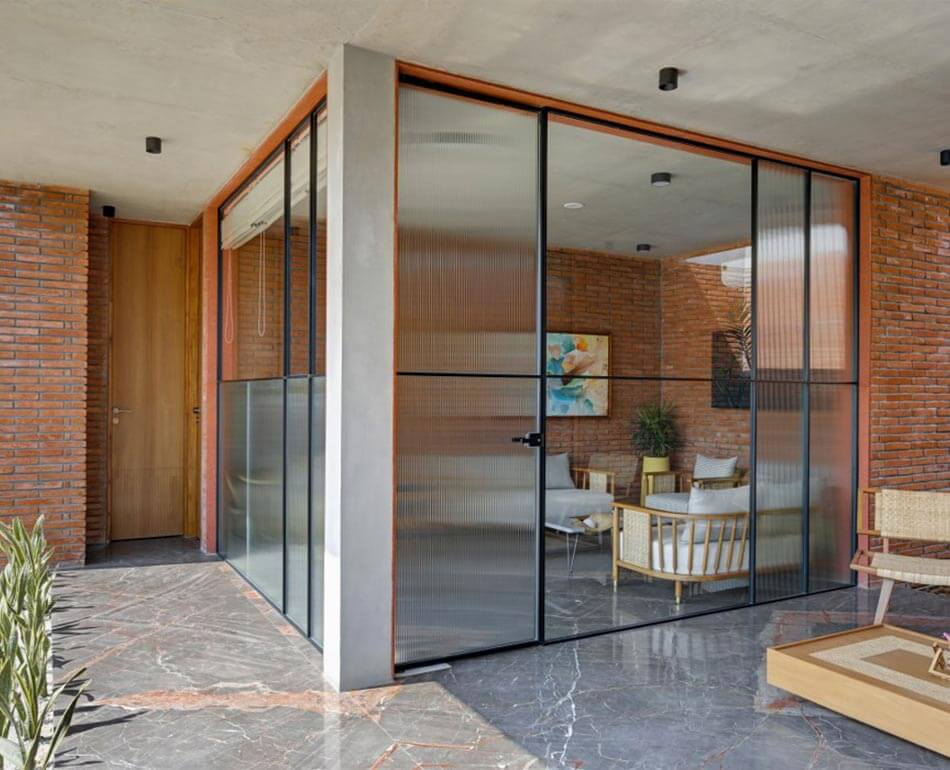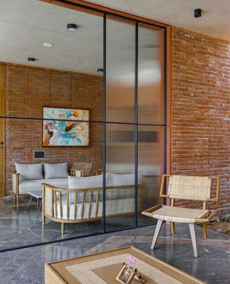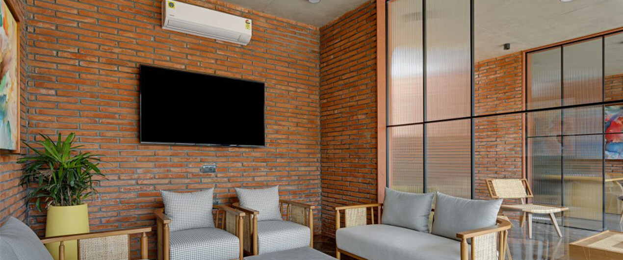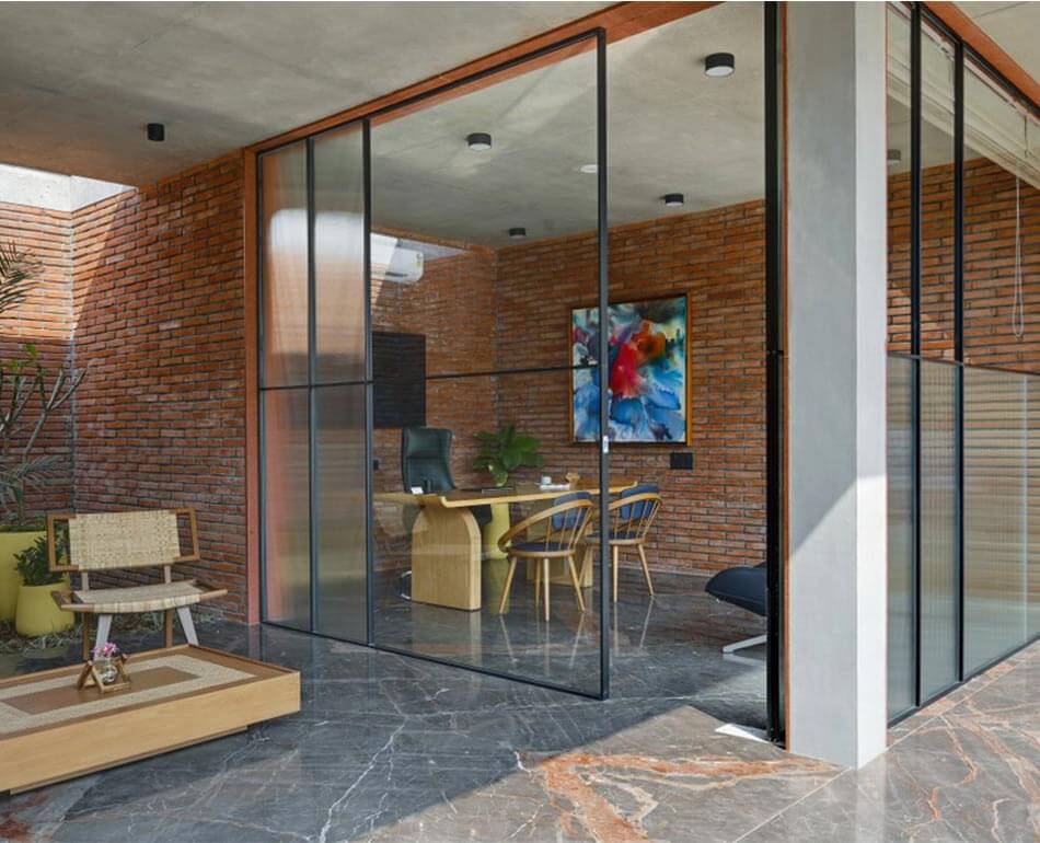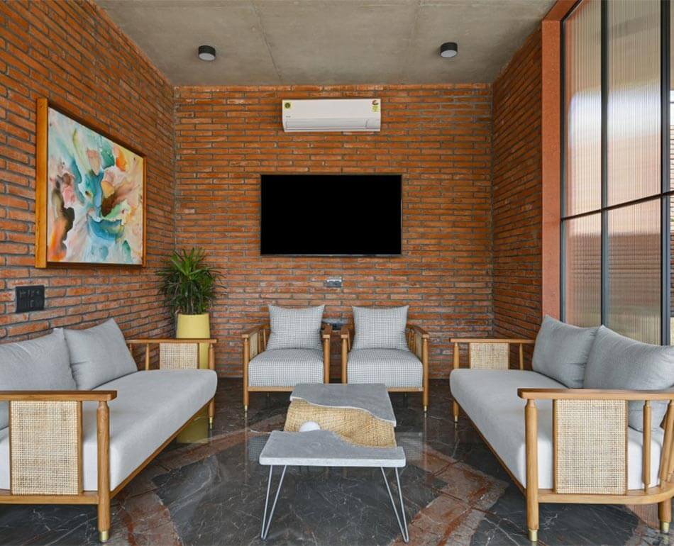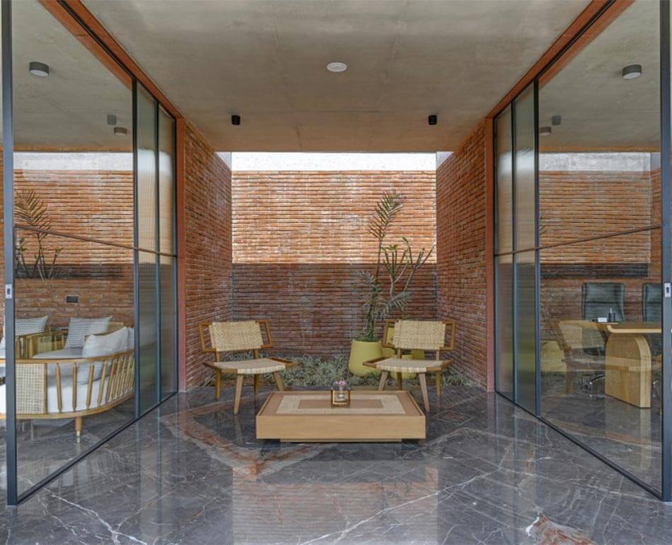 However, to add more zest to it we decided to design the flooring out of Marco polo which compliments the terracotta brick walls and rather uplifts the space by welcoming all the prospective buyers and making them feel at home.