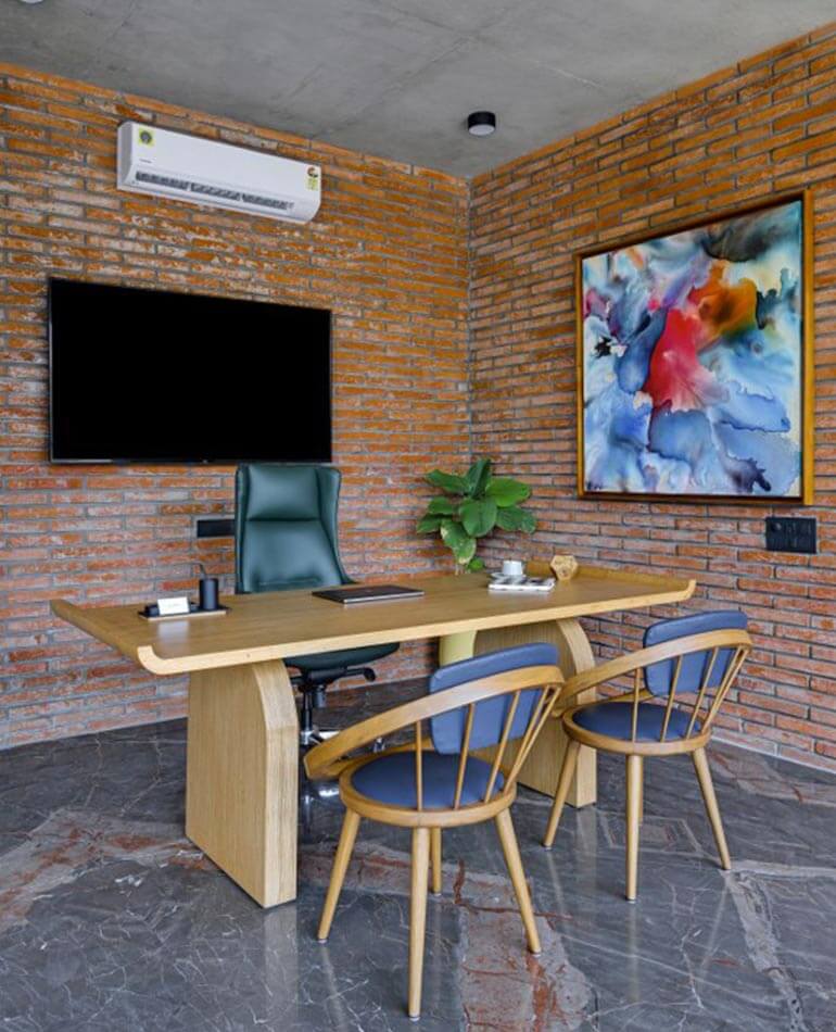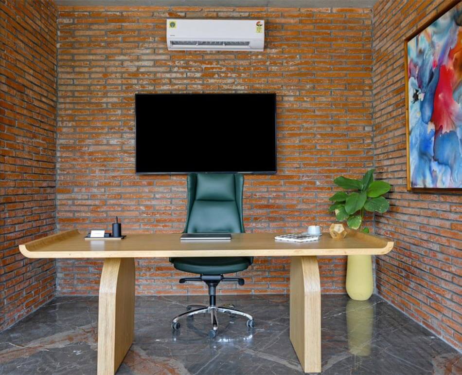 In addition to that, the executive table particularly designed out of Birch ply talks of minimalism and simplicity, and lastly, the splash of elements via Upholstery and the exquisite paintings makes an impression at a glance.