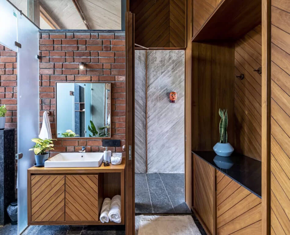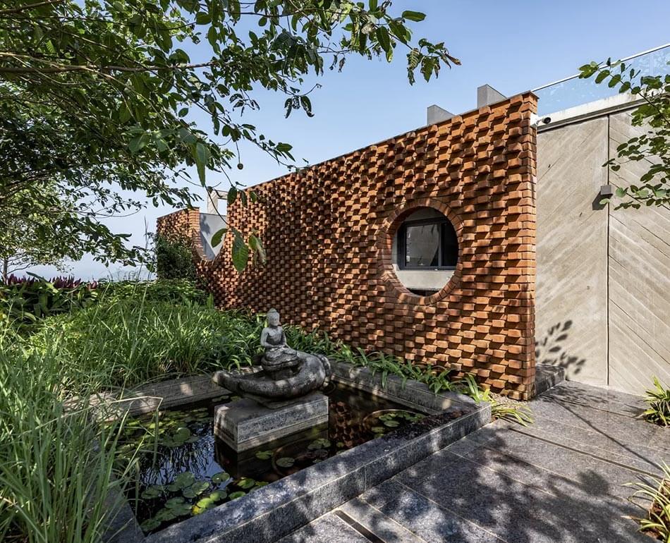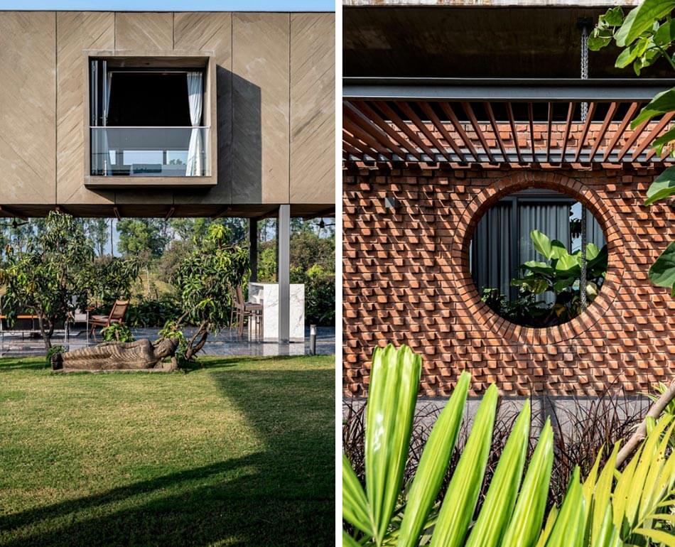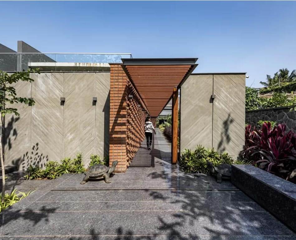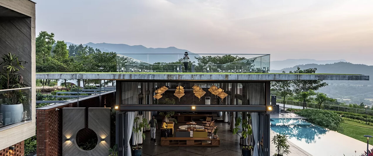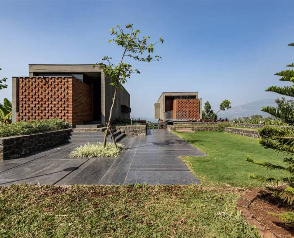 Set amidst the Sahayadris, the Weekend home at Maale sought to explore architecture in a hilly terrain for a limitless open space. The context presented an enchanting site with a 100 acres farmland. For the best viewpoint, a spot of an acre was chosen carefully – with Mulshi Dam backwaters at front and a hill at the rear. An attempt to create enclosures within nature by blurring the boundaries in the built-scape, the design weaves through spaces that redefine the idea of courtyards. Perceived as an unconfined set of spaces; an exposed brick wall winds through the three major independent built units: a pavilion, library, and a bedroom.