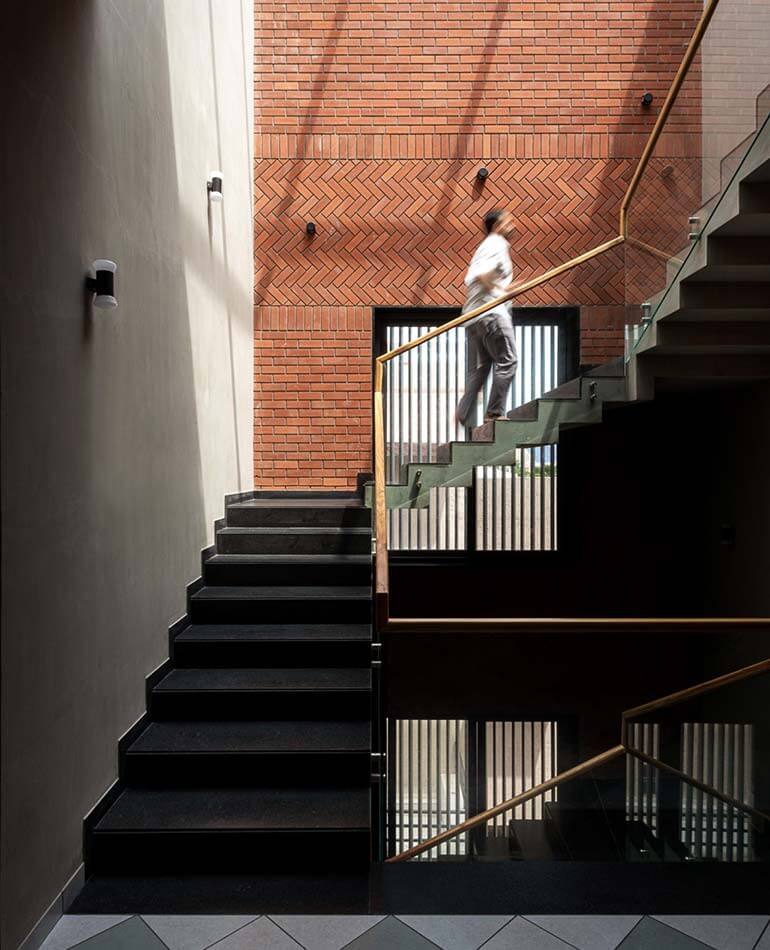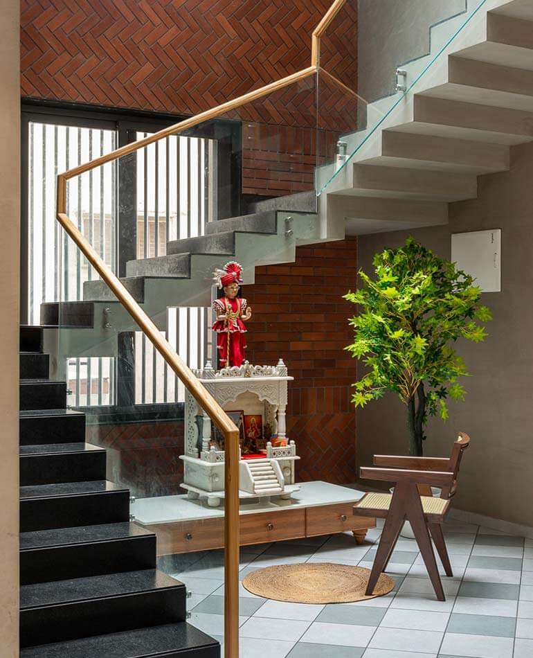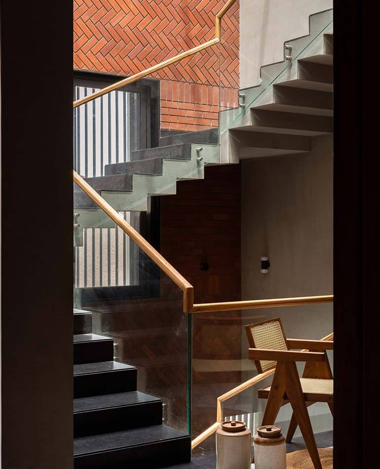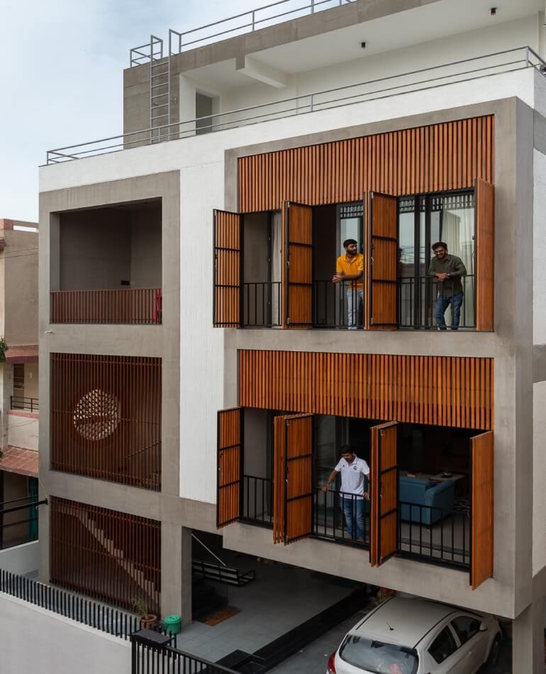 The Open-Shut house sits in a cluster of residential fabric with only the east and west faces free. Located in a remotely dense residential setting, the building façade faces the internal road with frequent vehicular movement. The designers decided to keep the north side for small openings rather than large ones as to not hinder the privacy of the inhabitants. Spanning four floors, the house inhabits not only four generations but also their individual needs catered to in a specific way.