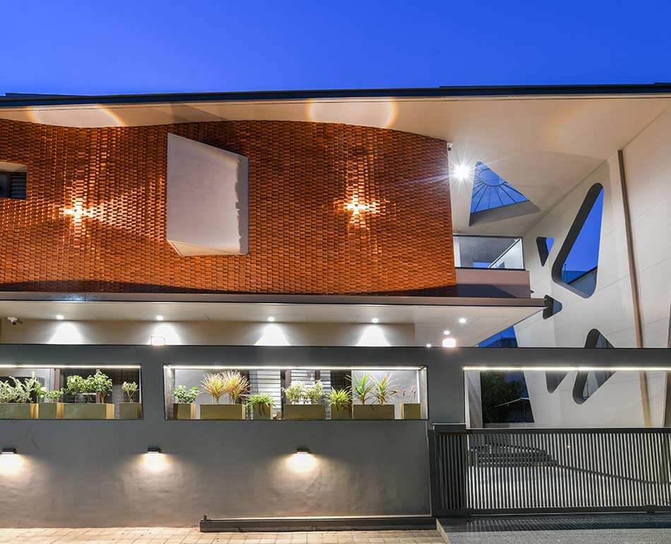 The bungalow project in Vadodara, set on a 2300 sqft plot with a 4050 sqft built-up area, boasts a striking front facade featuring a parametric exposed brick cladded wall. This design element adds a unique and dynamic aesthetic to the exterior. The property includes a double-height parking area, distinguished by innovative cut-outs on the side and top planes, enhancing both functionality and visual appeal.