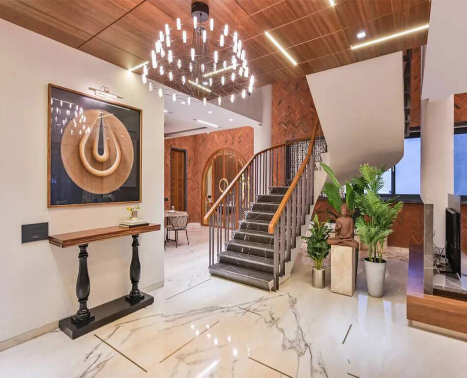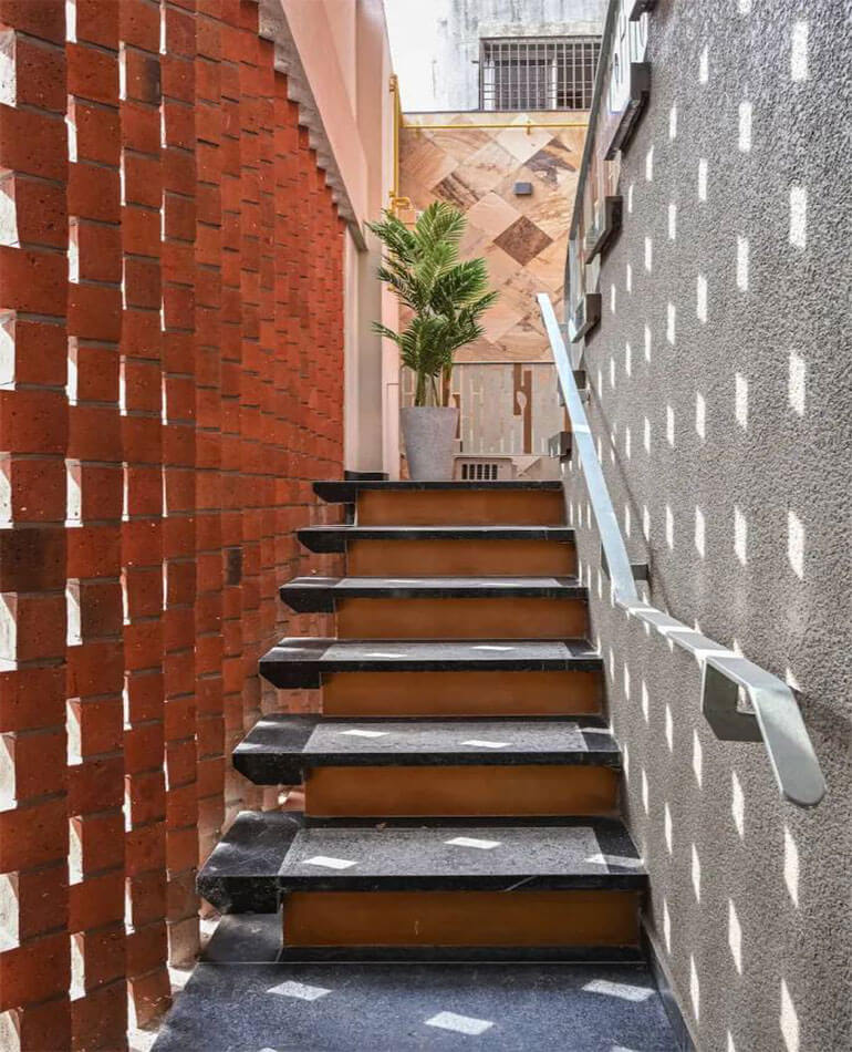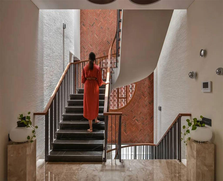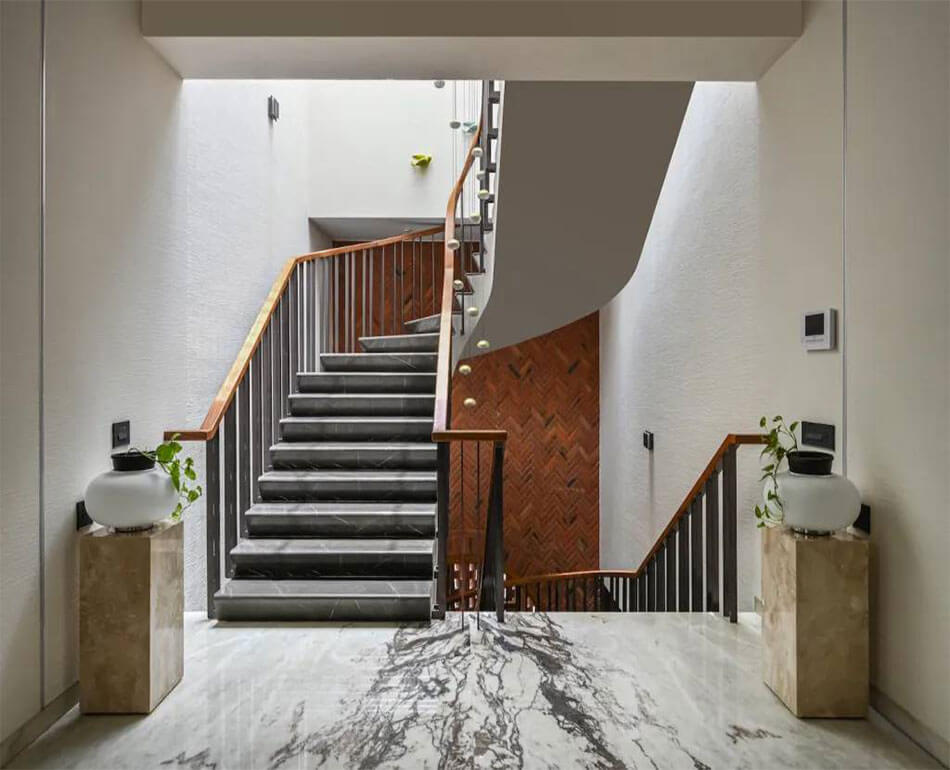 The home stands out from the neighbourhood thanks to its skewed brick wall. The entry gate features a laser cut-out pattern which makes for wonderful sciagraphy. The entrance foyer flaunts an inlay of yellow Jaisalmer and steel grey granite. The main door makes the transition between the rustic and the modern smooth, with the brass cut-out extending an elegant welcome. The door opens up to a sculptural staircase, which forms the spine of the design. The entrance passage divides the semi-private and private spaces.