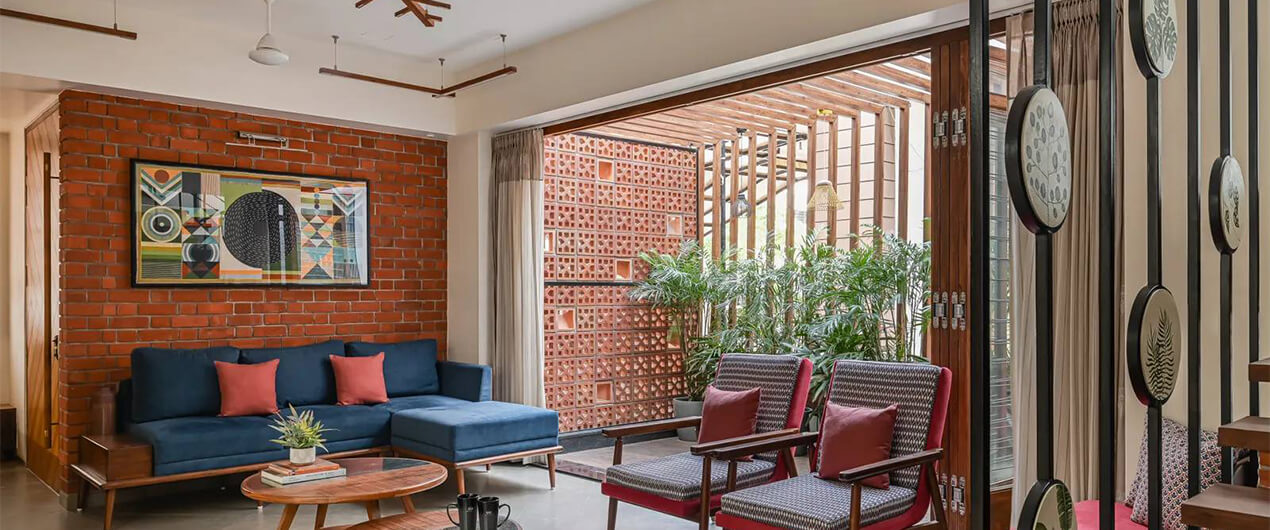 Noaidwin SttudioAs you step into the living room, a brick wall steals the spotlight with a Raza-inspired fabric artwork on it. The sliding-folding door converts the area into a balcony or an extension of the living room as desired by the owners. “We created a custom motif on the Kota stone flooring, and designed a chandelier that mimics this pattern to create a cohesive design from the ceiling to the flooring,” reveals architect Aparna Patel.